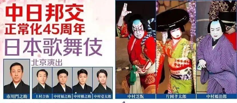 1955年10月至今,歌舞伎在中国举行了5场公演,最近一次是2017年 中日邦交正常化45周年 之际在北京天桥艺术中心,歌舞伎名家中村雁治郎、中村芝玩、片冈孝太郎等为中国观众带来《义经千本樱》《恋飞脚大和往来》和《藤娘》等歌舞伎经典剧目。
