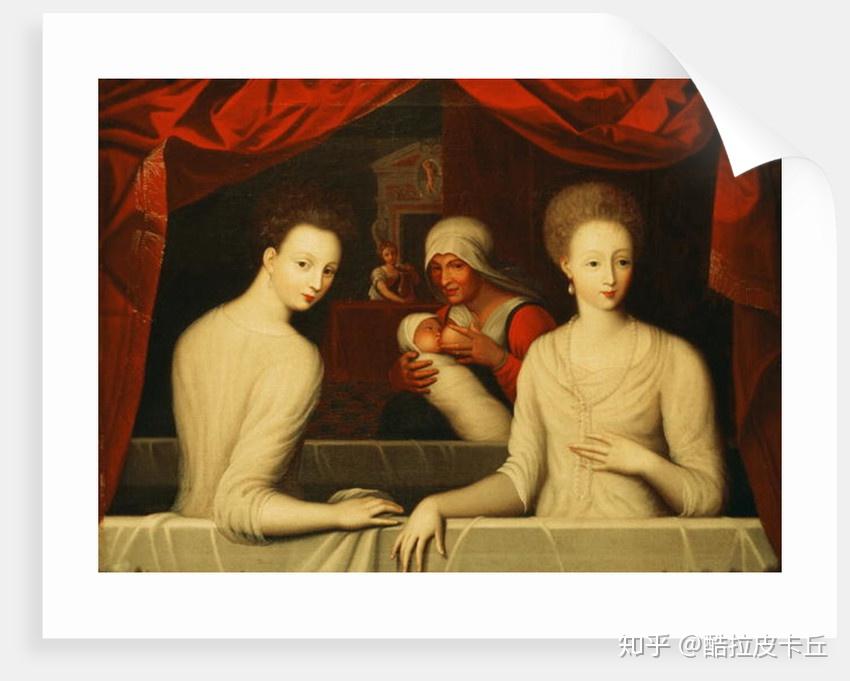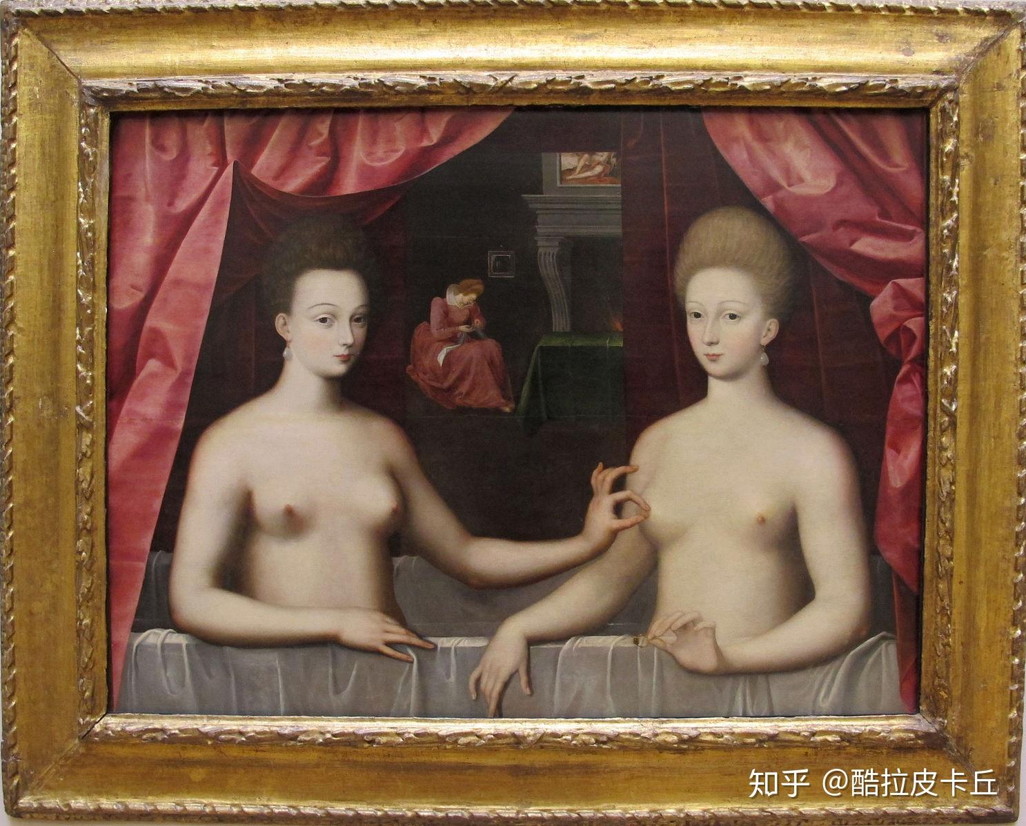 在卢浮宫看到这幅画的游客,要么羞羞答答不敢近前,要么兴致勃勃模仿这个经典的pose ,大概无不带有些猎奇的心态。事实上,这幅画没有落款,不知谁人所作,我们只能根据画中人物的发型来推断,大概完成于1594至98年之间;而后来一个版本上的题字则宣称,左边的金发女子就是上文中的嘉布里埃尔,而左边那个调皮的“捏乳头”女子,是她的一个姐妹。初见这幅画时,总觉得有几分说不出来的别扭。思前想后,大概有这么几个地方值得玩味:首先是表情与眼神。从表情来看,可以说几乎没有表情,fine,这是传统;而眼神则接近空洞,如果说她们在看向什么,那么最有可能是看向画外的观众,赤身裸体的凡胎直勾勾地盯着你(虽然还不至于是马奈的奥林匹亚…),再加上这直白而大胆的动作,的确会让人觉得画中女子不够庄重,符合一名情妇、而非王后的身份。再则是身材。虽然这是一幅美女裸图,但几乎看不到令人荡漾的线条,这或许和当时宗教改革与反宗教改革浪潮中对身体的仇视有关,女性的线条被塑造成直线,铁管一样的束身衣仿佛将身体捆缚在生硬的铠甲里,掩饰一切胸部、腰线和臀部的曲线,而即便是在这裸体图上,也依然能看到对肉体曲线的敌意。可即便身上其他部位的曲线没有凸显,肚子的圆润还是表现出来了——圆肚子在中世纪和文艺复兴艺术中正是女性美的一项重要特征,代表着富饶和丰产。但嘉布里埃尔的圆肚子还不仅仅只是“美”,加上旁边的Julienne d'Estrées捏乳头的动作,暗示嘉布里埃尔是真有孕在身——或许,就是那个本来能为她带来王位、却最终将她领向死亡的第四个孩子。她手上的那枚戒指就能印证这个猜想。国王亨利四世以其节俭和素朴闻名,据说他曾拒绝为心爱的嘉布里埃尔买戒指,只因为戒指太贵;虽则如此,在1599年3月2日,国王却将自己当初迎娶法兰西时的加冕戒指赠与了为他怀上第四个孩子的嘉布里埃尔,以此作为订婚戒指,承诺她将成为自己的合法妻子和王后。只可惜,一个月后,婚戒的女主人死在了婚礼前夕。