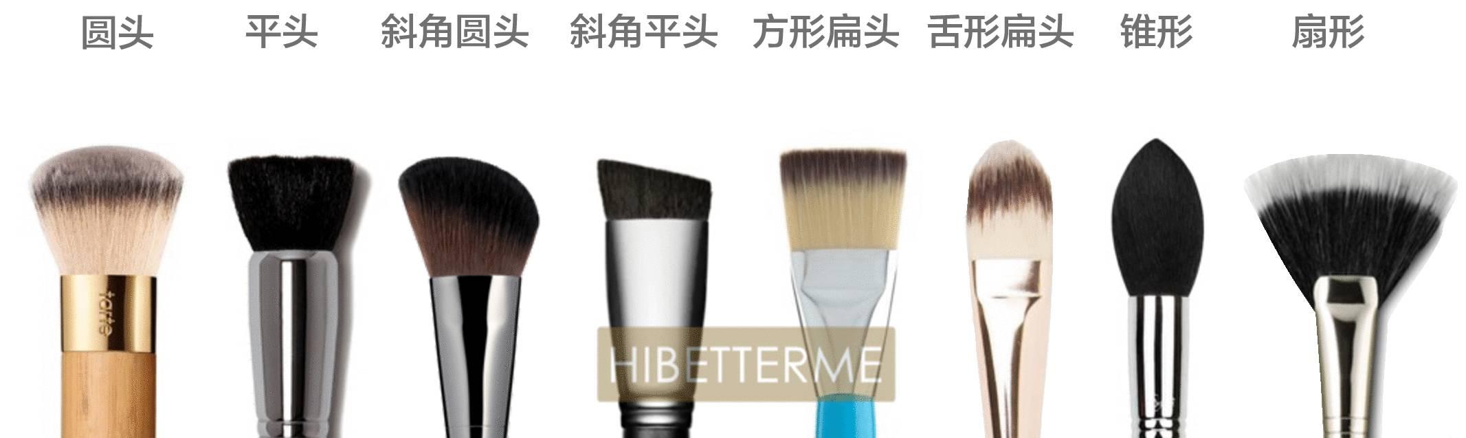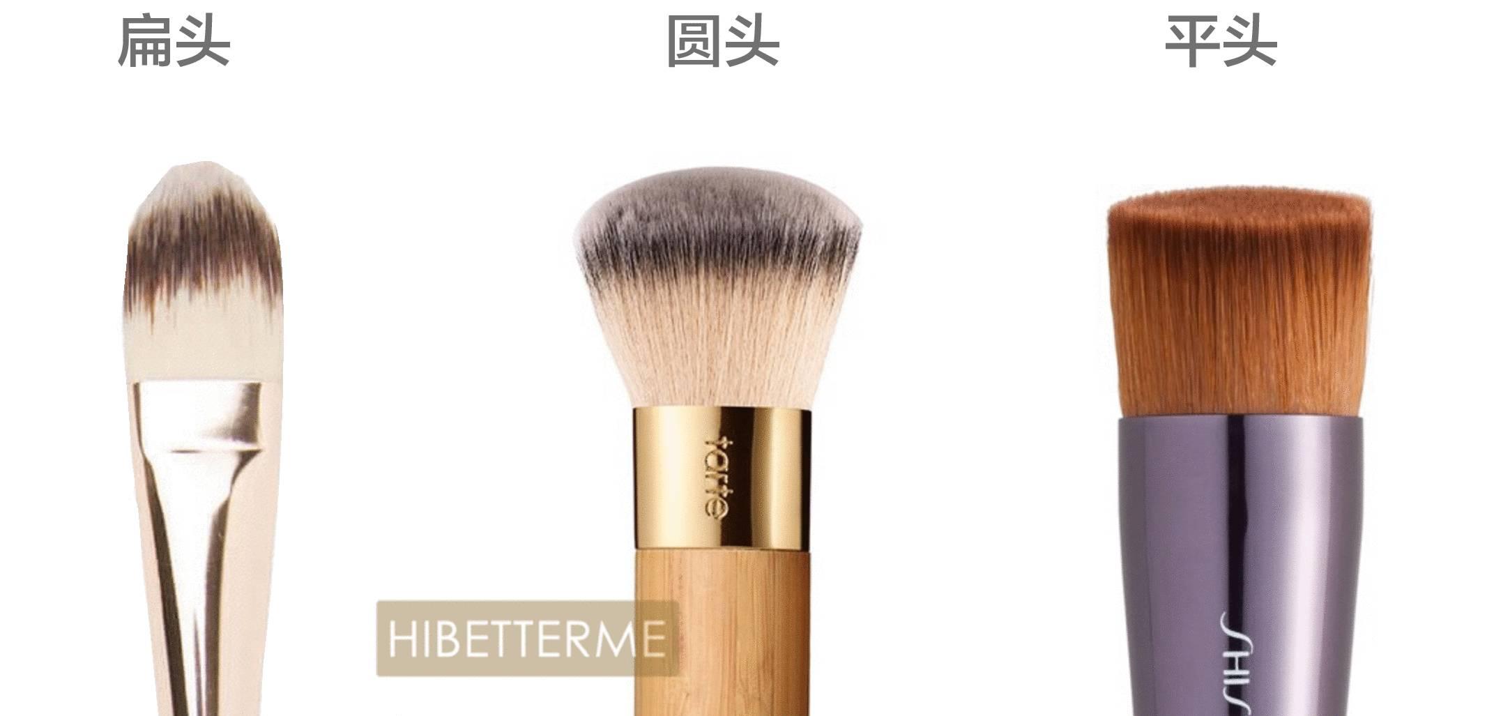 每种形状的刷头都有自己相应的功能范围。市面上常见的底妆刷刷头形状有:扁头、圆头、平头。