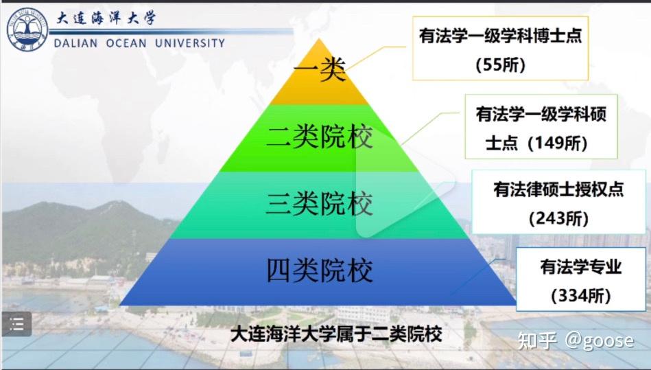 全国本科院校共1200多所, 大连海洋大学 为国家海洋局与辽宁省共建高校,综合排名在200-300之间,在前25%的水平。在此说明一个个人观点: 双非学校各种排名的意义不太大,地域影响更为现实。 如甘肃政法大学虽综合排名300多名,但法学评估为B,依然实力强劲,但我并没有选择甘肃政法大学,因考虑到地理位置,甘肃的气候并不太适合我,学校影响力主要在西北,实习、就业资源受经济发展情况限制也并不乐观,这对就业导向的专硕来说很不友好,遂作罢。大家专硕尽量选一二线经济相对发达的城市,学硕前面提到了,准备继续升学读博的话还是法学学科评估重要。