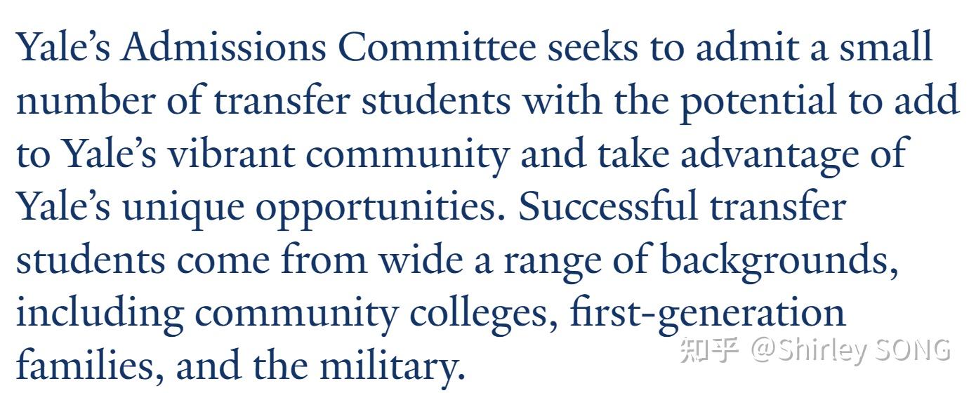 目前学校官网虽然一改往年措辞,加上了社区大学、第一代大学生以及军人,但是鉴于耶鲁大学每年录取的转学人数基本只有20人左右,还是不建议大家重点考虑。