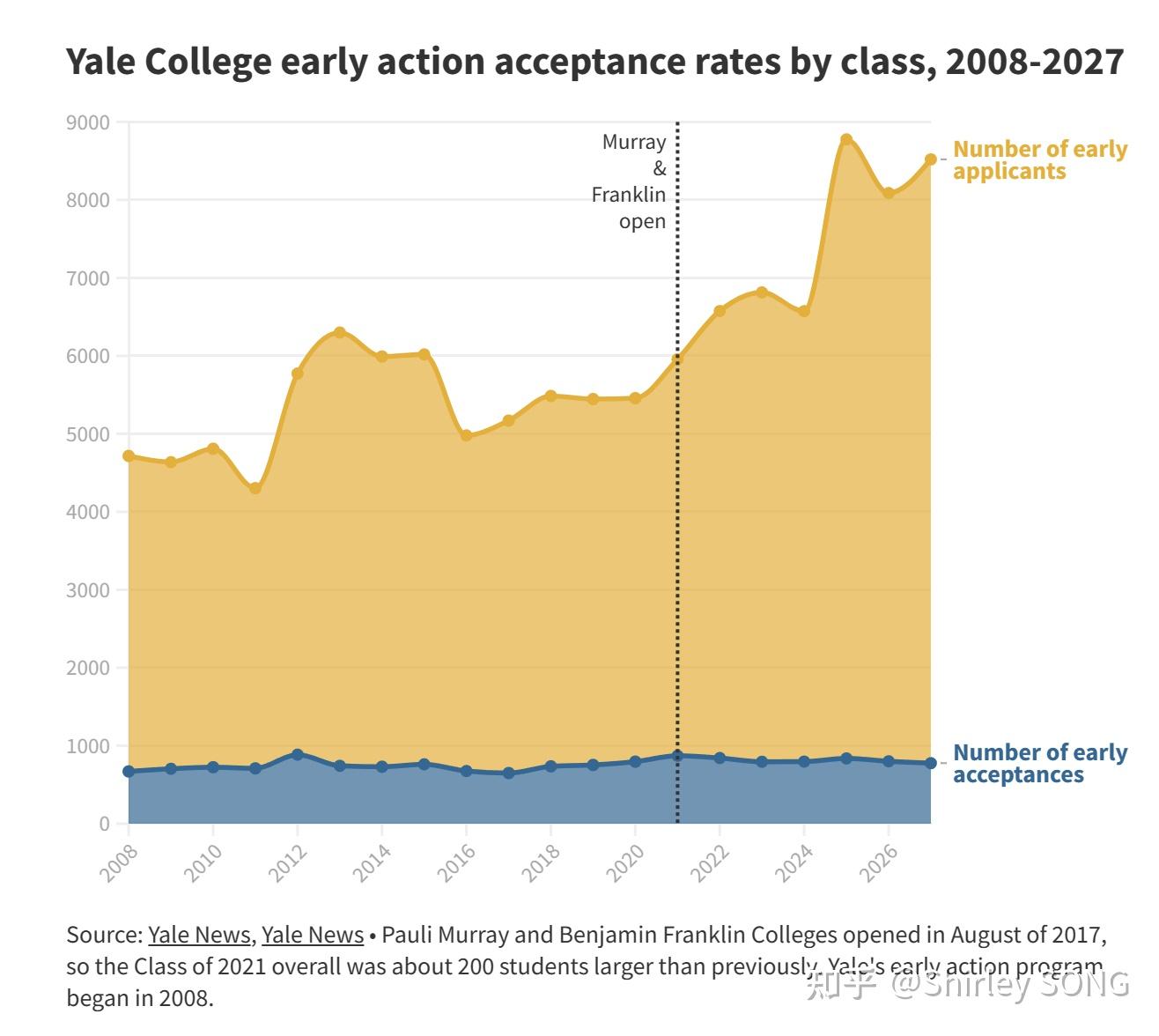 美国时间2022年12月15日,耶鲁大学发布了2022-2023申请季(2023年秋季入学,即2027届毕业生)的SCEA申请结果。根据学校官方Yale News提供的数据,耶鲁大学本申请季SCEA申请人数总计7,744人,仅次于2020-2021申请季的早申历史最高申请人数7,939人,比2021-2022的7,288人增长了6.3%,录取人数776人,比去年的800人减少了3%,为自2017年创办Pauli Murray and Benjamin Franklin Colleges以来的最低水平。