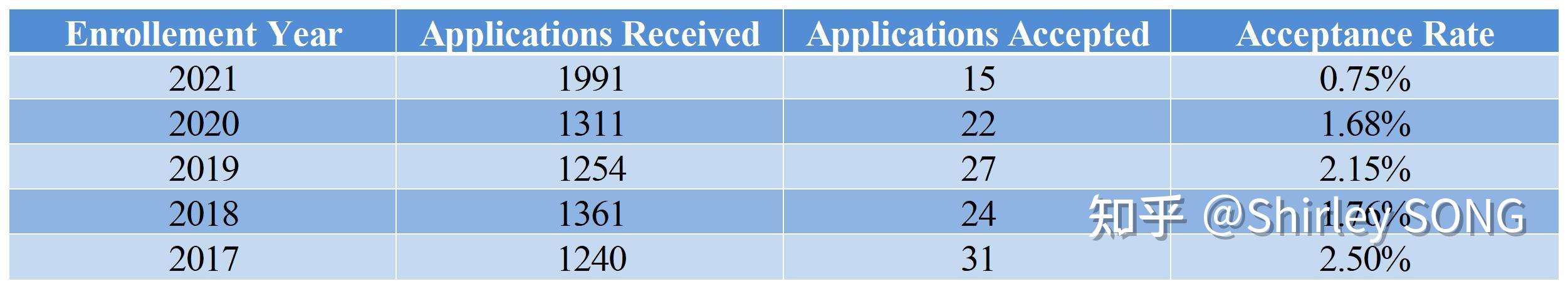 根据上图可以看出,耶鲁大学转学申请人数基本在1500人左右,转学录取率基本在1%左右浮动,可谓是美国转学申请最难的院校之一。