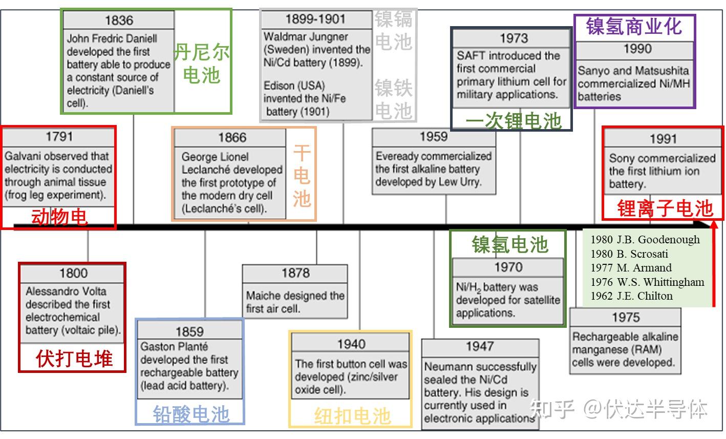 如图5所示,从1800年伏打电堆(Voltaic Pile)被发明以来,电池技术经过了多次迭代更新。1991年锂离子电池商业化应用对人们的生活方式尤其是3C消费类电子产品的影响是巨大的,而锂离子电池的技术经过了1959-1991年30多年的不断演化和优化才得以最终应用。