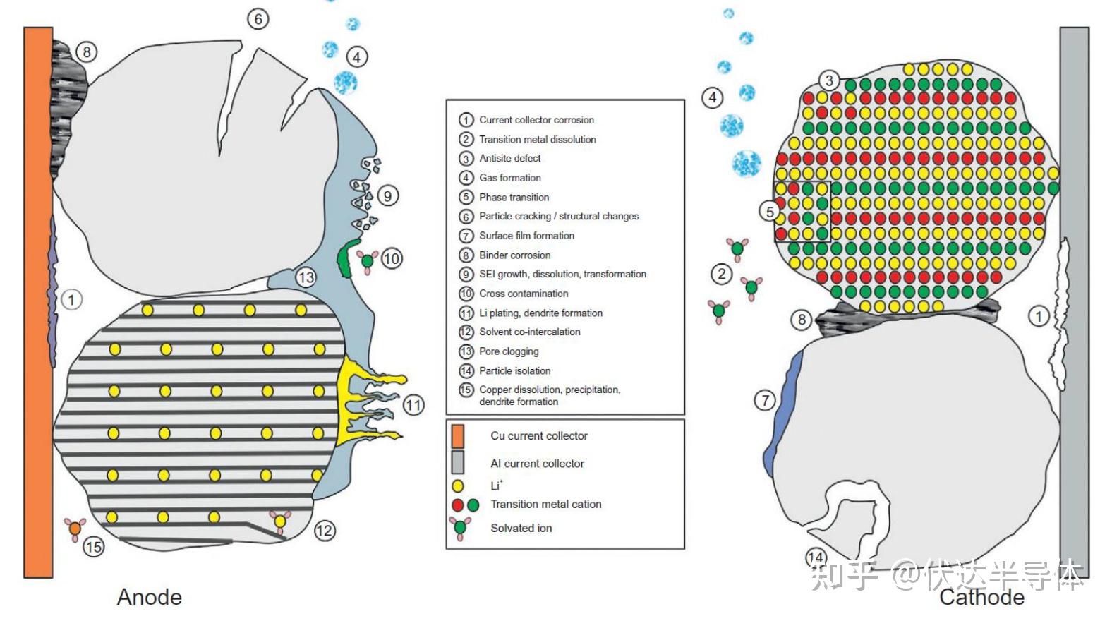 在持续的充放电或放置过程中,锂离子电池内部的副反应不断累积,如图2所示,电池内部的副反应可以分为15类之多。