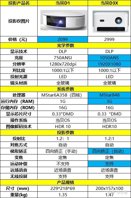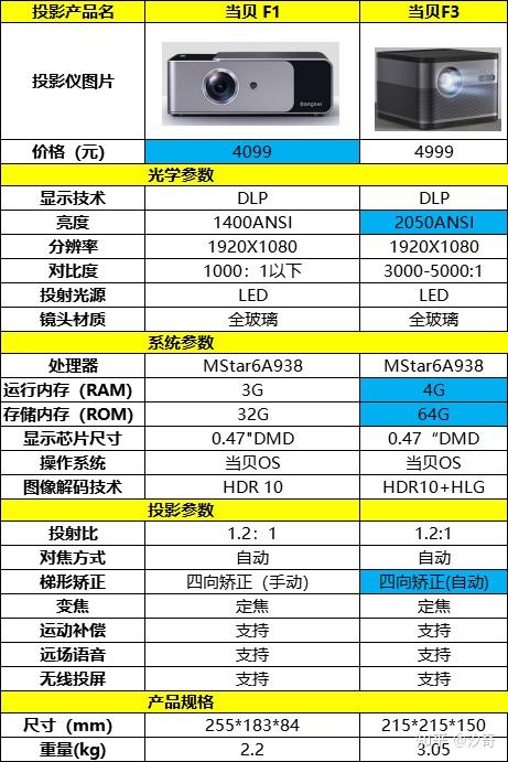 同价位投影仪参数对比如下表,浅蓝色部分是对比参数有优势的部分,手机端看不清的话,可以点击图片,查看原图。