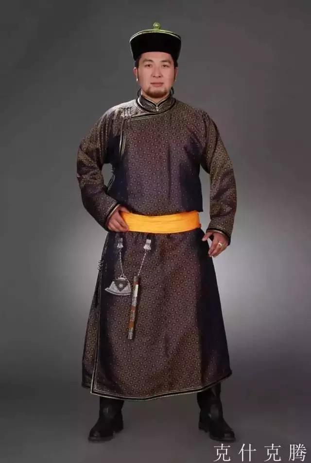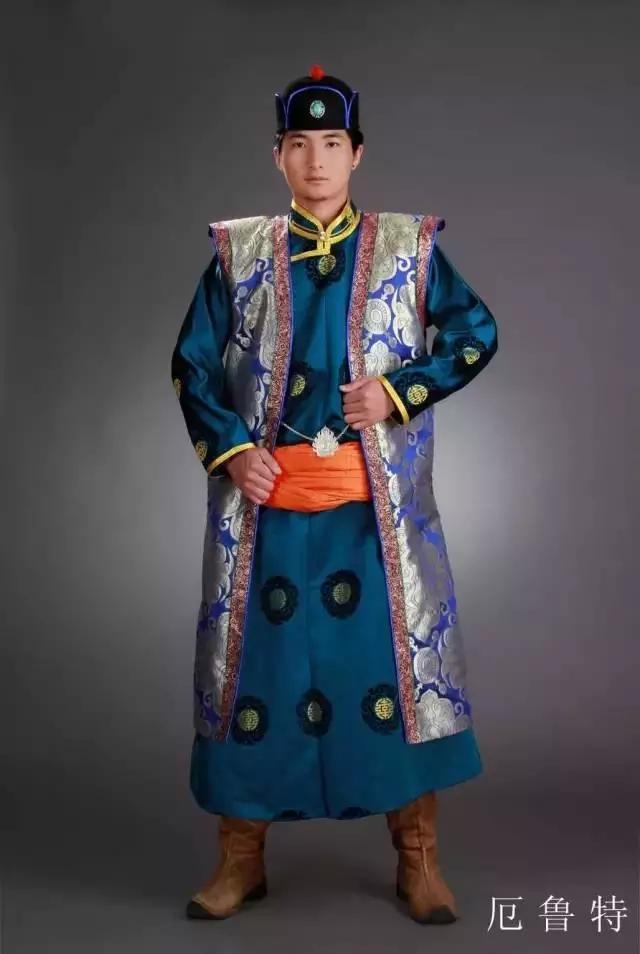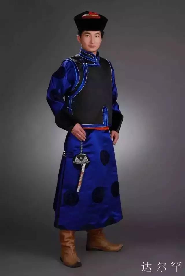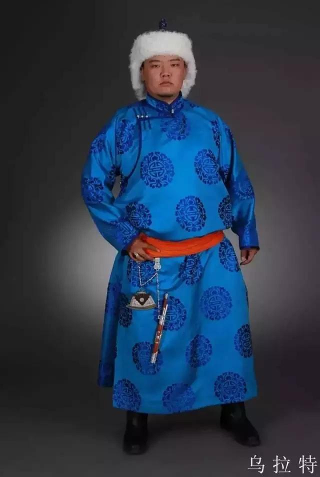 为了骑乘方便,男子服装多为宽领大袖。棉 、皮长袍用棉布领或绵羊羔皮领。长袍外套马夹,以整幅彩色绸缎系腰,不垂穗,佩带火镰、蒙古刀。刀有刀鞘,并有象牙筷子或驼骨筷子一双,用银 、白铜、青铜镌花制成,用绒丝链挂在“套海”(一种金属饰物)上。腰佩火镰 、蒙古刀、烟荷包、烟袋、白布手巾等。头顶的蒙古帽 ,多为绵羊羔皮或狐皮制成。冬季,衣袖外套有绵羊皮套袖。