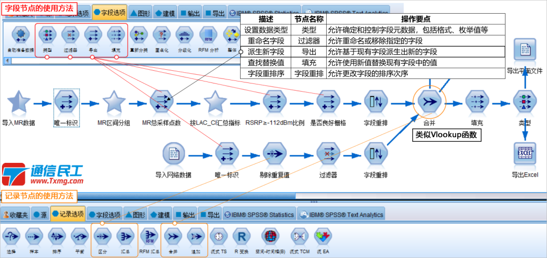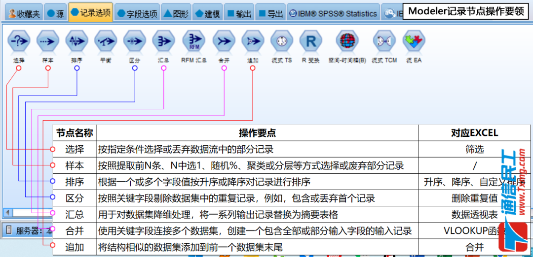过程节点主要由记录节点、字段节点、图形节点和建模节点组成,可从一张数据表出发,记录节点对应行(记录、样本),字段节点对应列(字段),数据预处理要做的便是对行和列数据处理,最后输出规整的数据表。