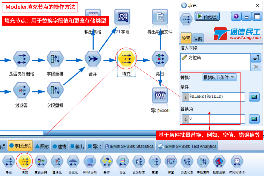 >>填充节点: 在数据预处理的数据清理中,用于替换字段值和更改存储类型,例如,将某些字段属性值中错误的数据或空值替换为指定的数据。