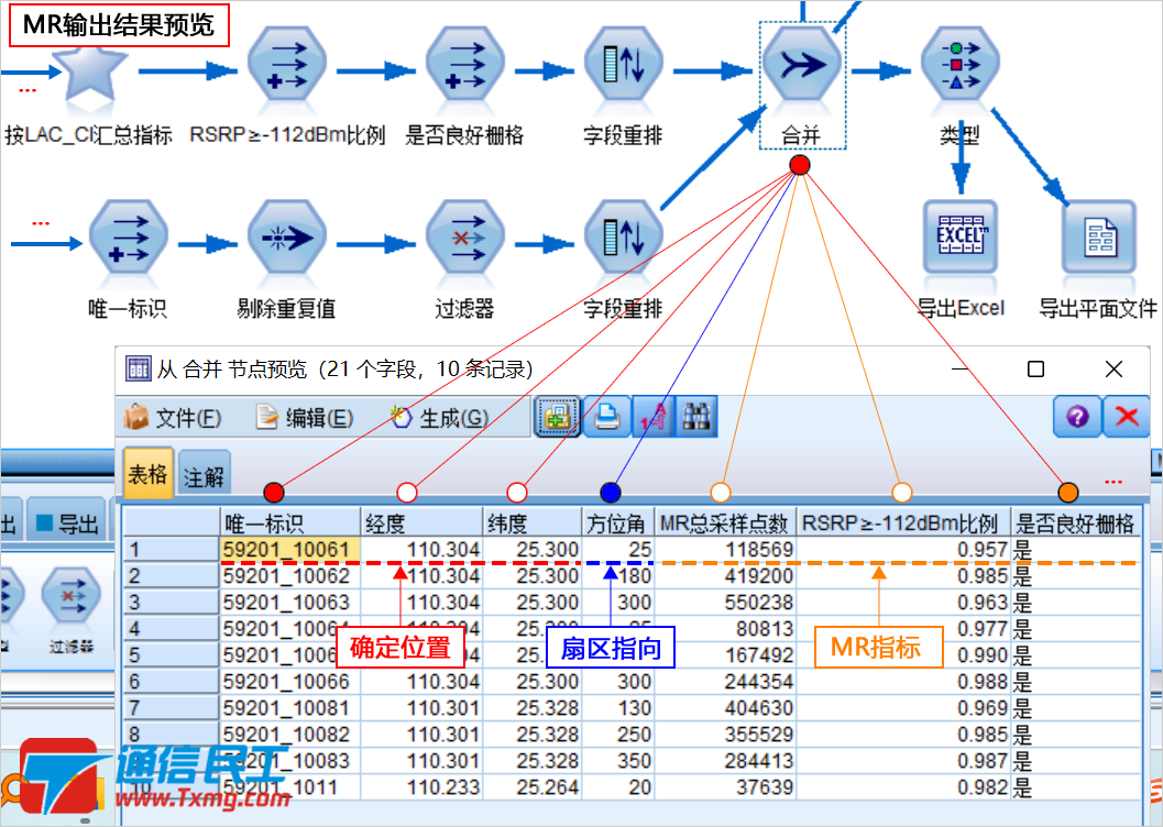 MR数据为网络指标,若要添加工程参数(方位角),需使用“导出”节点创建唯一标识(连接符为"><",与&功能类似),建立表间联系后,使用“合并”节点将各种数据引用过来(合并节点=VLOOKUP)。
