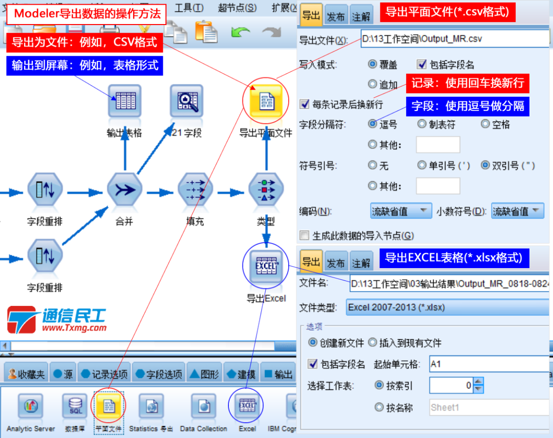 一个流程有起点和终点,起于因,终于果,对应计算机的输入和输出。Modeler工具由数据源输入,经过若干个流程环节(节点),输出成预期的成果。