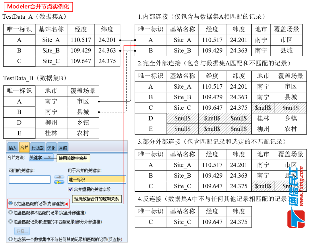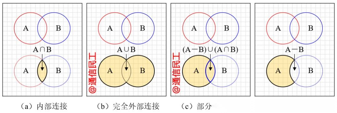 (3)将概念翻译成图: 打开来看,使用关键字合并会涉及“内部连接”、“完全外部连接”、“部分外部连接”、“反连接”等新的逻辑关系。