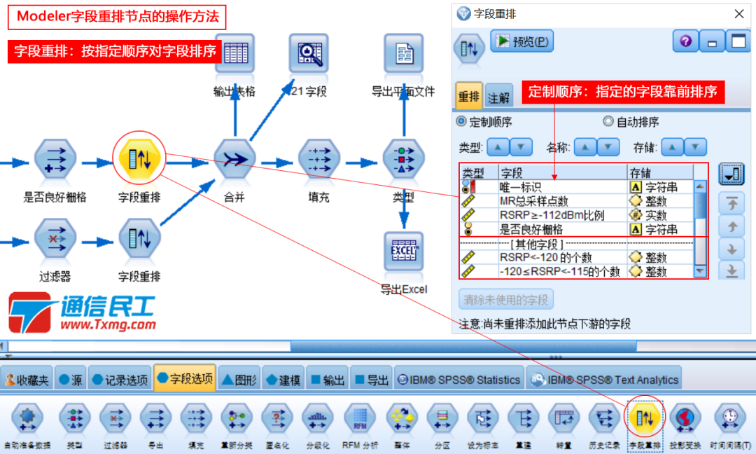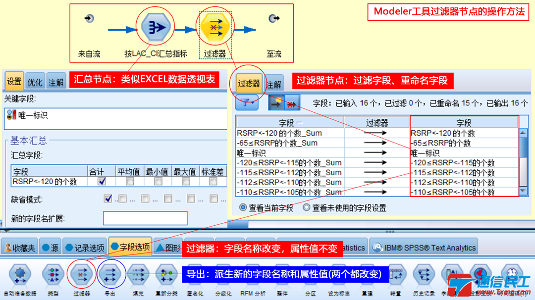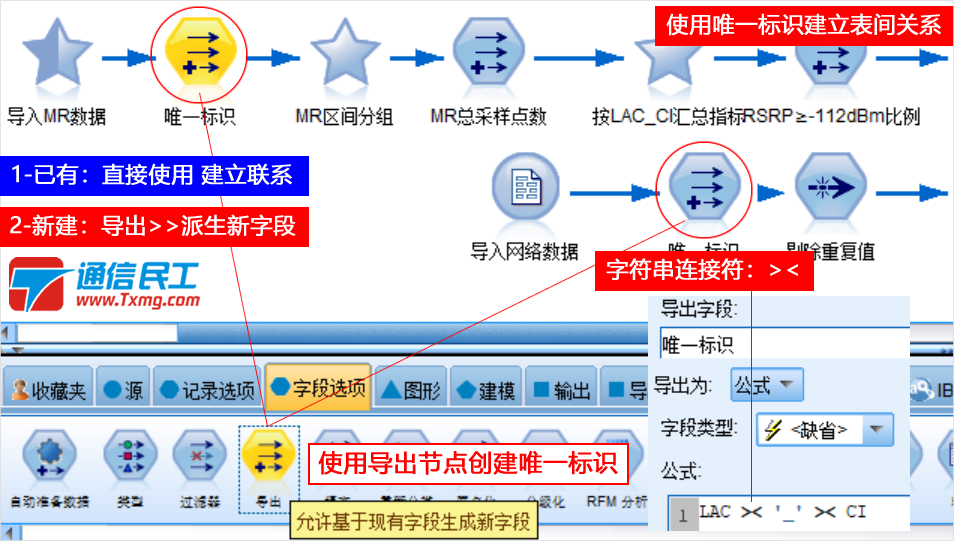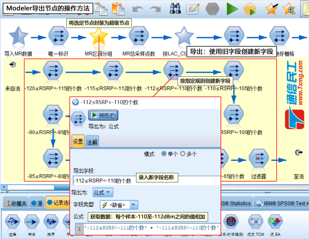 -->导出节点: 在Modeler数据预处理中很常用,可使用导出节点基于现有字段派生新字段及其属性值,例如,使用导出节点中“导出为公式”的操作方法,将RSRP指标分区间汇总统计和派生出新字段。