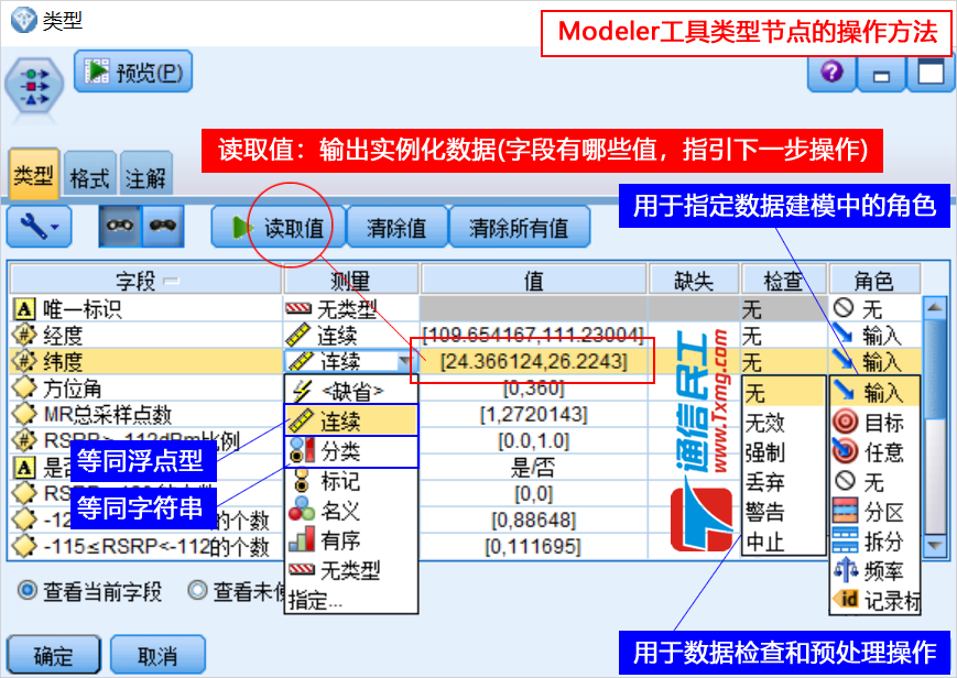 例如,在类型节点中设置数据类型,主要是点击“读取值”,输出实例化数据,亦可根据实际设置测量级别、检查类型和字段角色等。