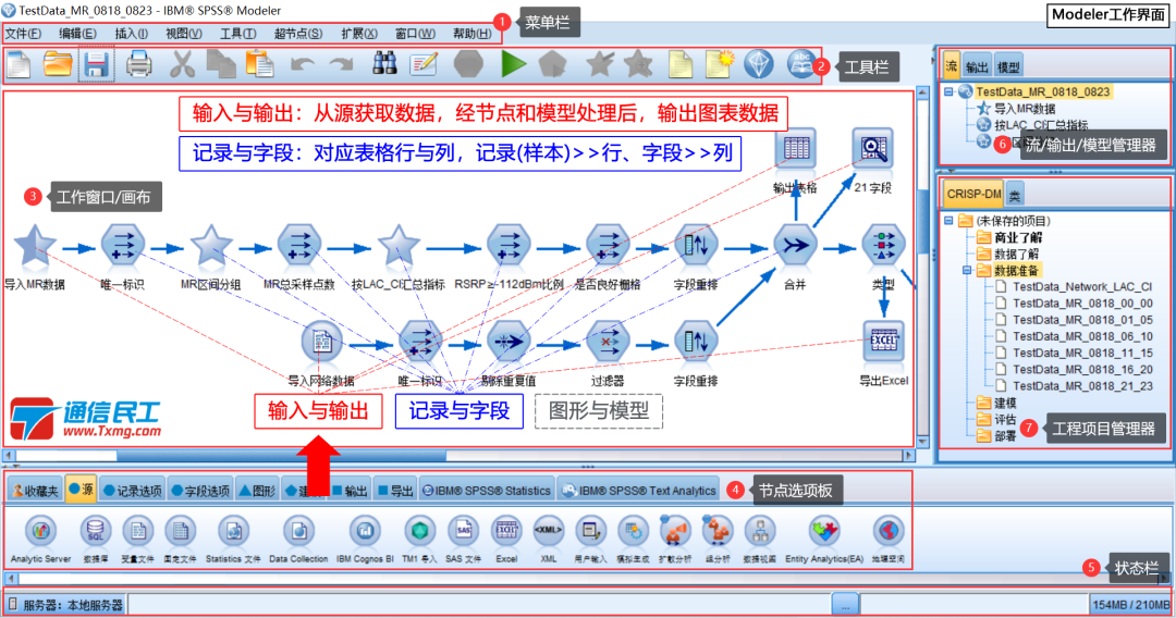 你会发现,Modeler工具主要由菜单栏、工具栏、工作窗口、节点选项版、流管理器、工程管理器等模块组成的,“节点”是其关键模块,得节点者得Modeler。