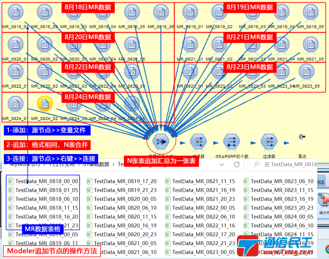 >>数据汇总: 将若干张表整在一起。格式相同用 追加 (多张表粘在一起),格式不同用 合并 (类似Vlookup,例如,将MR数据与网络工参做数据关联,添加方位角)