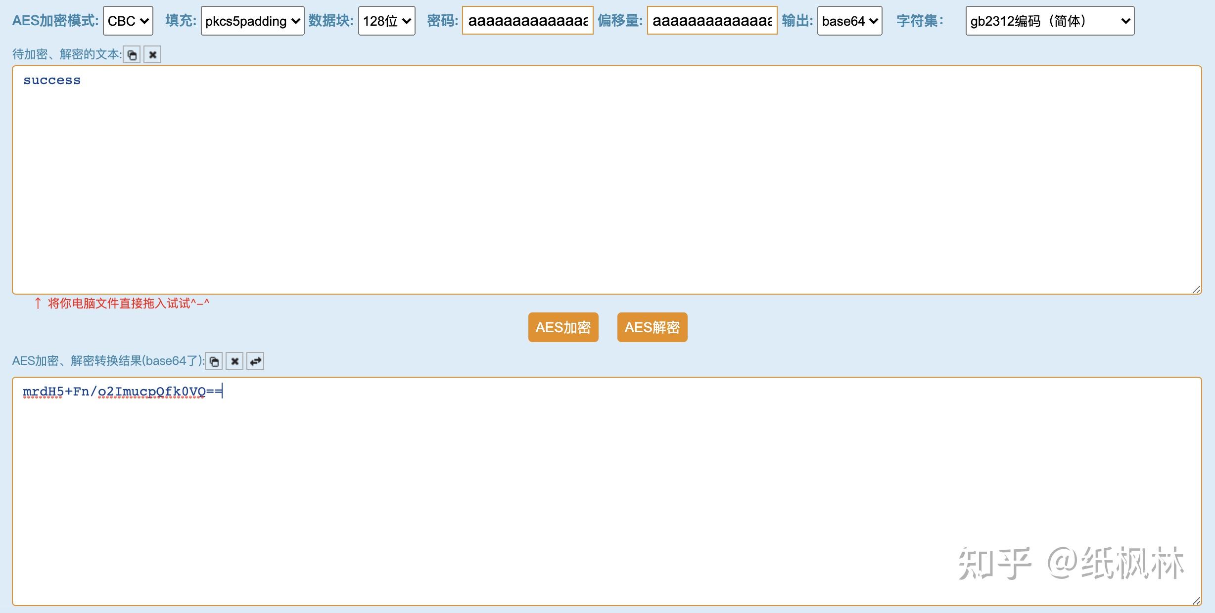 官方指定的加密方法是:AES/CBC/PKCS5Padding,使用32个 a 对 success 加密结果是:mrdH5+Fn/o2ImucpQfk0VQ==