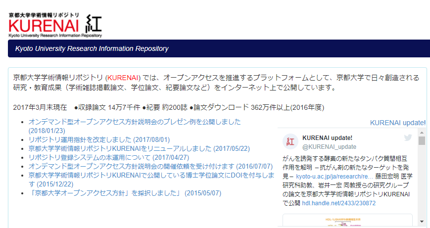 收录了京都大学在校师生在校内外发表的论文、学位论文、纪要、校内刊物。截止至2017年3月底,共收录了论文14.7万篇,纪要200多篇。