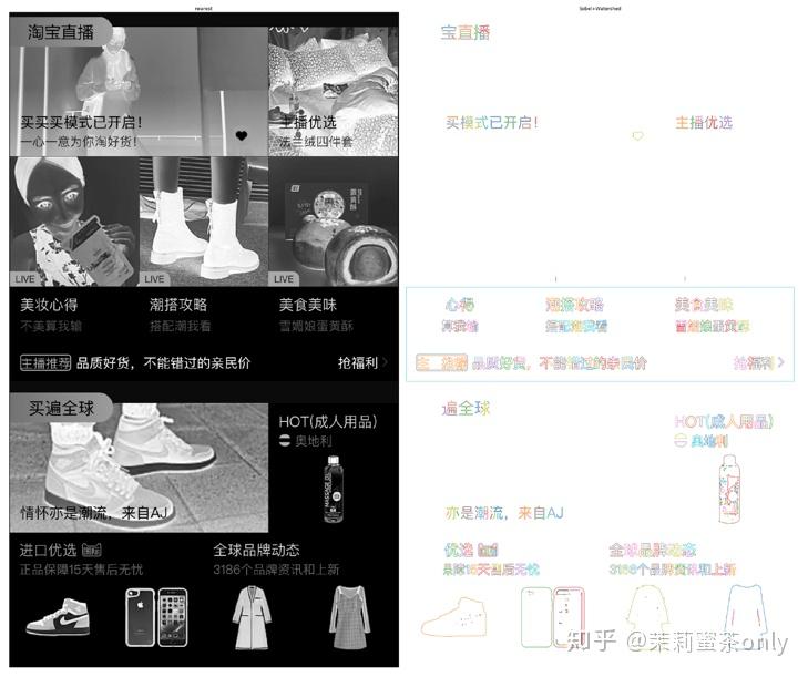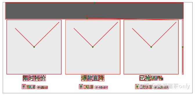 采用OpenCV进行测量、计算,然后用规则尝试提取有用的特征数据,结果并不理想,可以看到,图上半部分已经被我用阈值过滤掉商品留下文本,但同时文本也有缺失,例如"买买买模式已开启"识别后只有"买模式已开启"被准确识别。同时,图下半部分效果更差,商品实体并没有被剔除掉。所以,阈值在进行特征提取的时候会遇到大量的问题,因此,还是要回到用机器学习的模型来进行识别,总结归纳UI元素的特征。