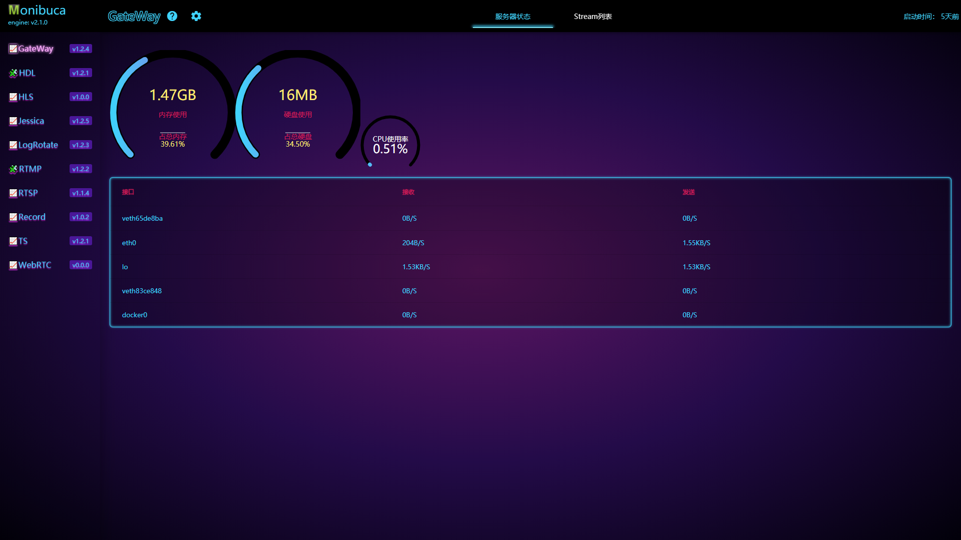 Monibuca 是一个开源的Go语言实现的流媒体服务器开发框架。适用于快速定制化开发流媒体服务器,可以对接CDN厂商,作为回源服务器,也可以自己搭建集群部署环境。 丰富的内置插件提供了流媒体服务器的常见功能,例如rtmp server、http-flv、视频录制、QoS等。除此以外还内置了后台web界面,方便观察服务器运行的状态。 也可以自己开发后台管理界面,通过api方式获取服务器的运行信息。 Monibuca 提供了可供定制化开发的插件机制,可以任意扩展其功能。