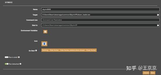 由于mod的加载需要在游戏的exe文件上添加参数,所以直接用steamVR里面的上古卷轴启动游戏是无法加载并使用前面提到那些mod的,所以最后一步是在vortex软件里DASHBOARD界面(红圈)中上古卷轴栏目新建(红圈1按钮)一个游戏快捷选项用于启动游戏,新建时填写的参数如下面第二个图所示,以后玩游戏的时候进入steam VR,然后从vortex里使用这个游戏快捷选项(红圈2)启动游戏就可以正常加载和使用mod了。