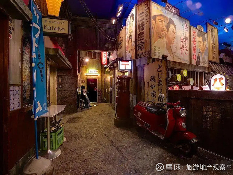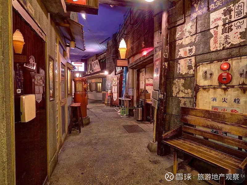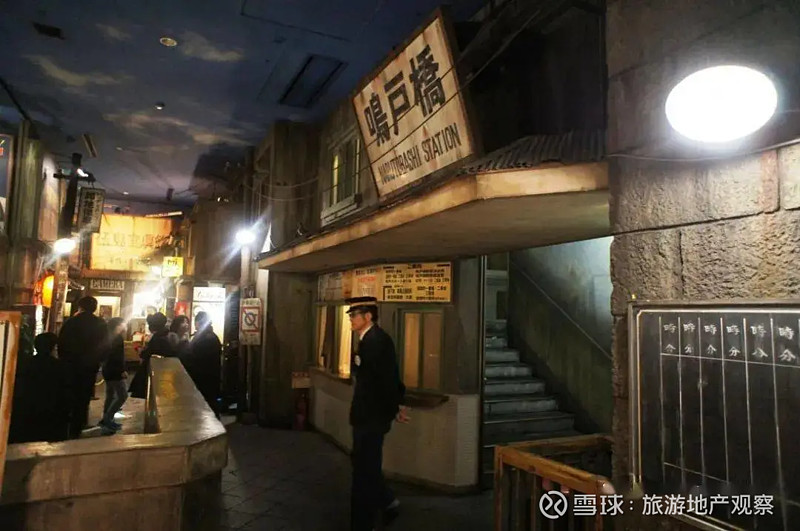 地下一层如同电影《三丁目夕阳》中展现的昭和30年代(1955-1964年)的街头布景,整个空间营造出日落黄昏的景象,街边遍布着各行各业的店铺,诊所、邮局、小卖铺、书店、裁缝铺等,不时还有下班的邮差和打更人在街头执勤。