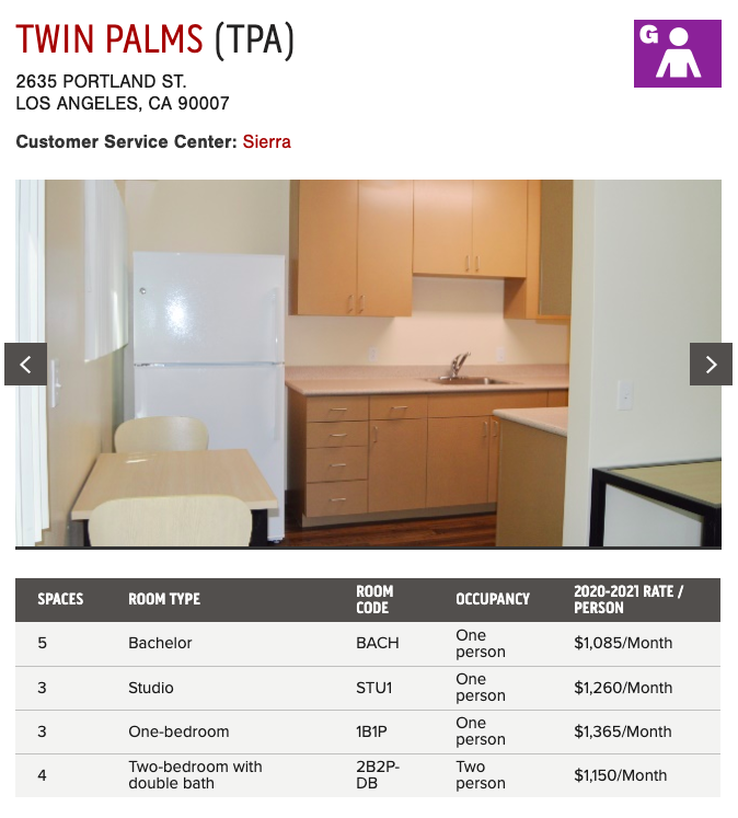 USC的研究生宿舍管理还是比较好的,设施也比较齐全,至少大件家具都有,不过说实话价格位置和校外比也没太大优势。具体的宿舍、价格、位置、房型、设施、租期要求等等的在官网上都可以清楚地查到,比如twin palms:
