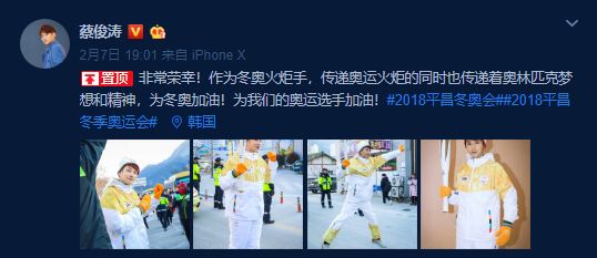 其中还有一条微博令我印象深刻,是关于今年年初蔡俊涛代表中国演艺界人士去参加平昌冬奥会圣火传递的。