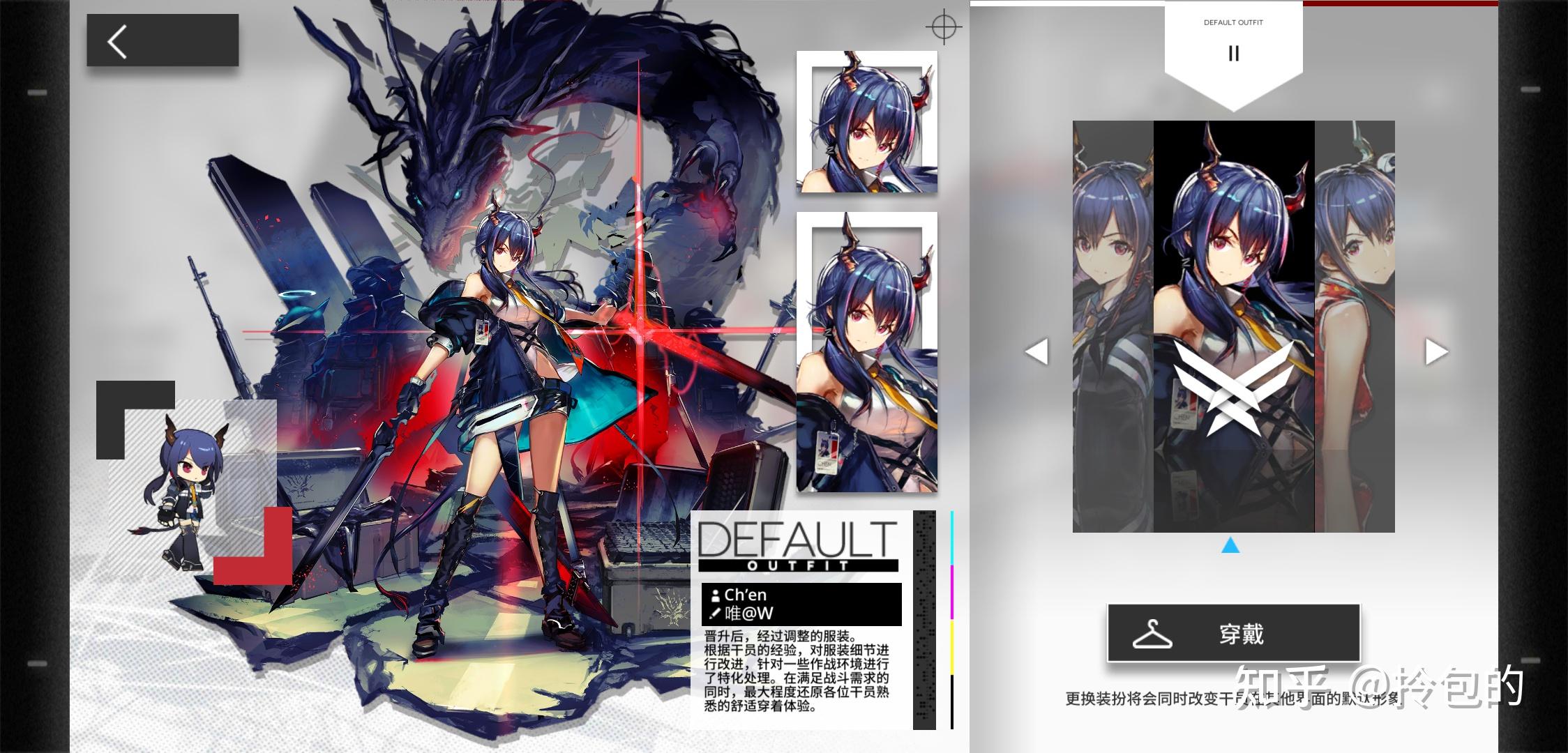 在这个前提下,再来看唯的作品,我大概理解她之所以可以作为主美的原因——他确实贴合方舟的风格,陈的精二颇有一种警队出动肃杀的氛围,冷色调中的高饱和度的红色赤鞘,龙的元素,也对应了陈的能力和战斗方式。