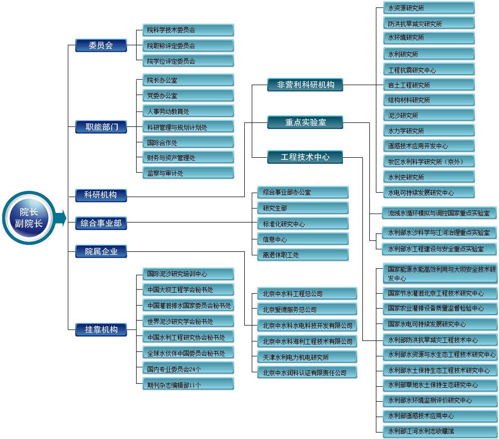 据2017年1月中国水利水电科学研究院官网显示,研究院设有5个院属企业、41个挂靠单位(其中国内专业委员会24个、期刊杂志编辑部11个)、13个非营利科研机构、1个国家重点实验室、2个水利部重点实验室、4个国家级研究中心、7个水利部研究中心/应用中心/收藏馆。