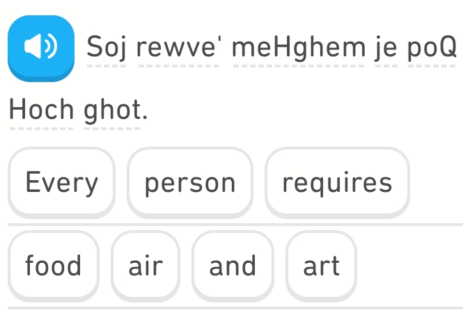 绝大部分虚构世界的“语言”,就是 胡乱发出一些没有任何逻辑的声音 。在这一层次,相对“高级”的方式是尽量让这些声音有统一风格的听感(底线是音系别太分裂,同一种语言,总不能上一集还是 几个单辅音和几个单元音交错搭配,全是开音节,音拍等时,音调平直 的听感,下一集就变成 各种复合辅音、复合元音再加上鼻化、塞音韵尾,长短分明,音调跌宕 的听感了)