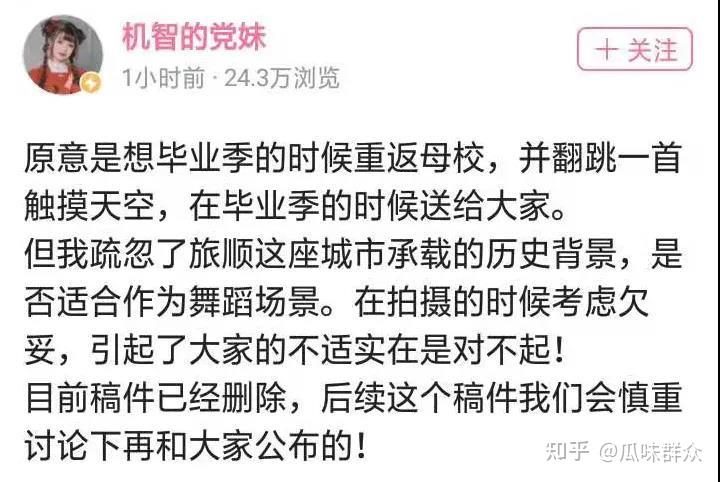 要是其他博物馆,还能说传统文化和现代宅舞的碰撞。旅顺博物馆绝对不可,因为旅顺博物馆是当年日军侵害的关东军司令部旧址,是中国民族伤痛之一。党妹竟然在那么严肃的地方跳宅舞,不被喷才怪。党妹被喷后,她光速删掉视频,道歉说自己拍摄考虑欠妥。
