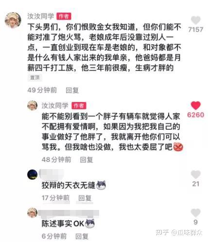 汝汝同学是洛丽塔网红,和胖乎乎的男友恋爱三年,还一起开了家jk制服店。汝汝同学恋爱三周年发dy视频纪念。原本是含糖量max的视频,但下面评论很恶心人。有好多男粉丝骂汝汝同学是拜金女,因为喜欢男朋友的钱,所以才和男朋友在一起。汝汝同学随后置顶评论解释:男朋友是普通家境,他是生病才那么胖的。网友能不能别看到一个胖子就觉得不配有爱情。