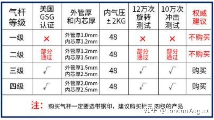 一般气压棒都有 SGS通标 , 德国TUV , 美国BIFMA 等认证。说明书上也会标注生产厂家,海外有 韩国的KGS、三弘 ,国内有 安徽莱特 , 台湾WDF , 广东协强 等。