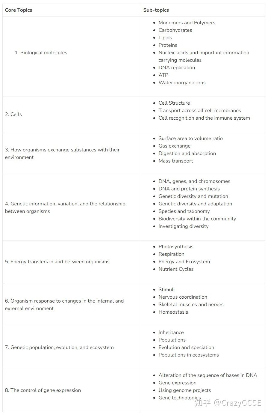 具体因考试局而异,但 一般来讲,你将学习以下topic。 可以发现很多内容GCSE阶段已经学过了,A-level增加了更多的细节,而A-level生物也加入了一些更高级的知识,为学生升学做准备。