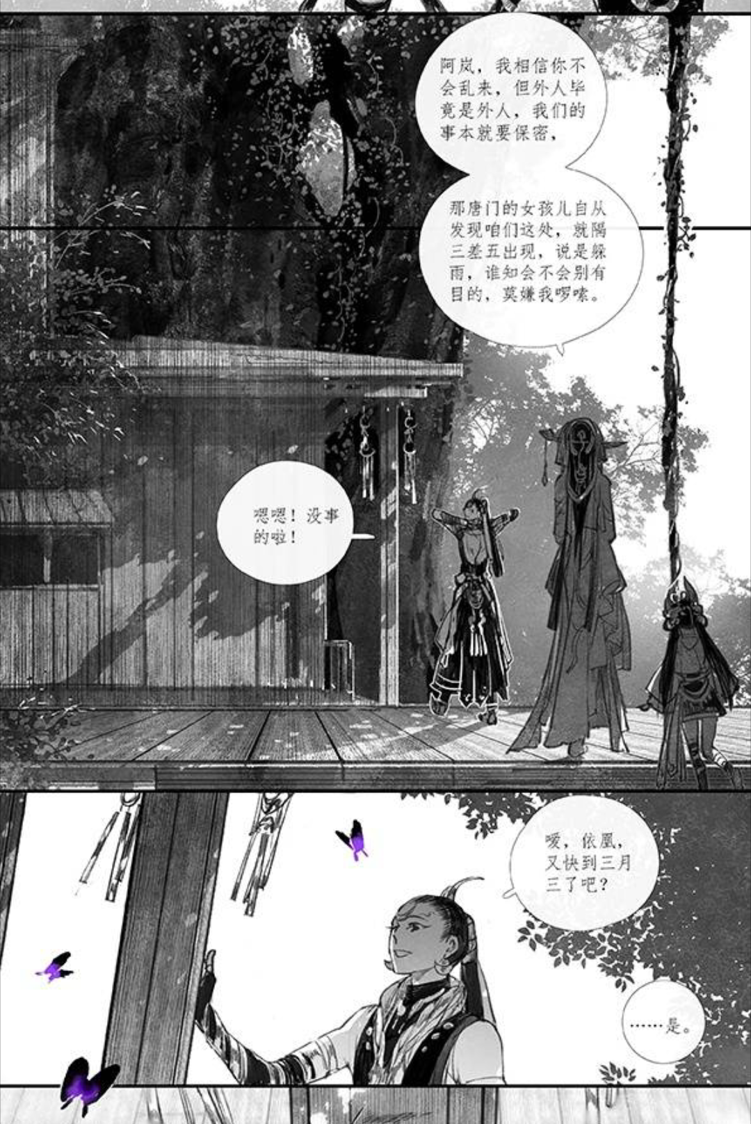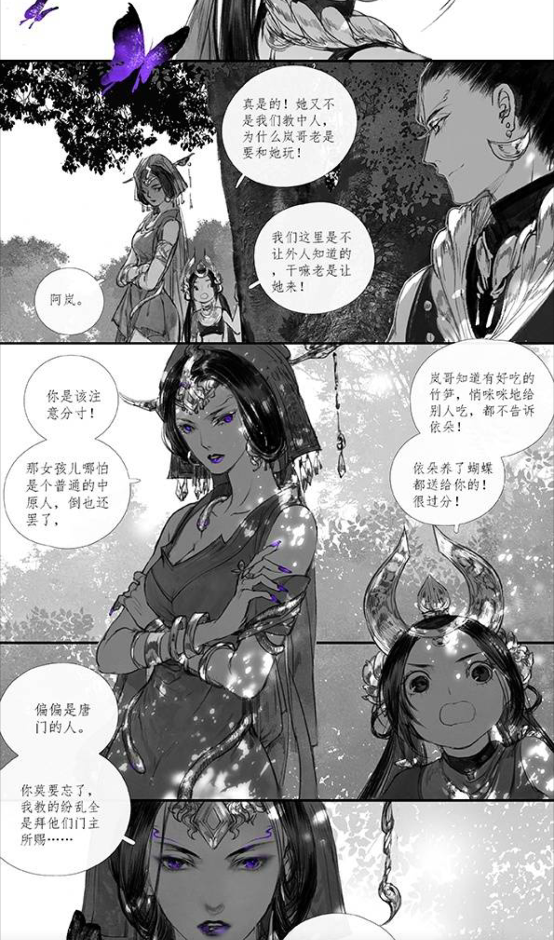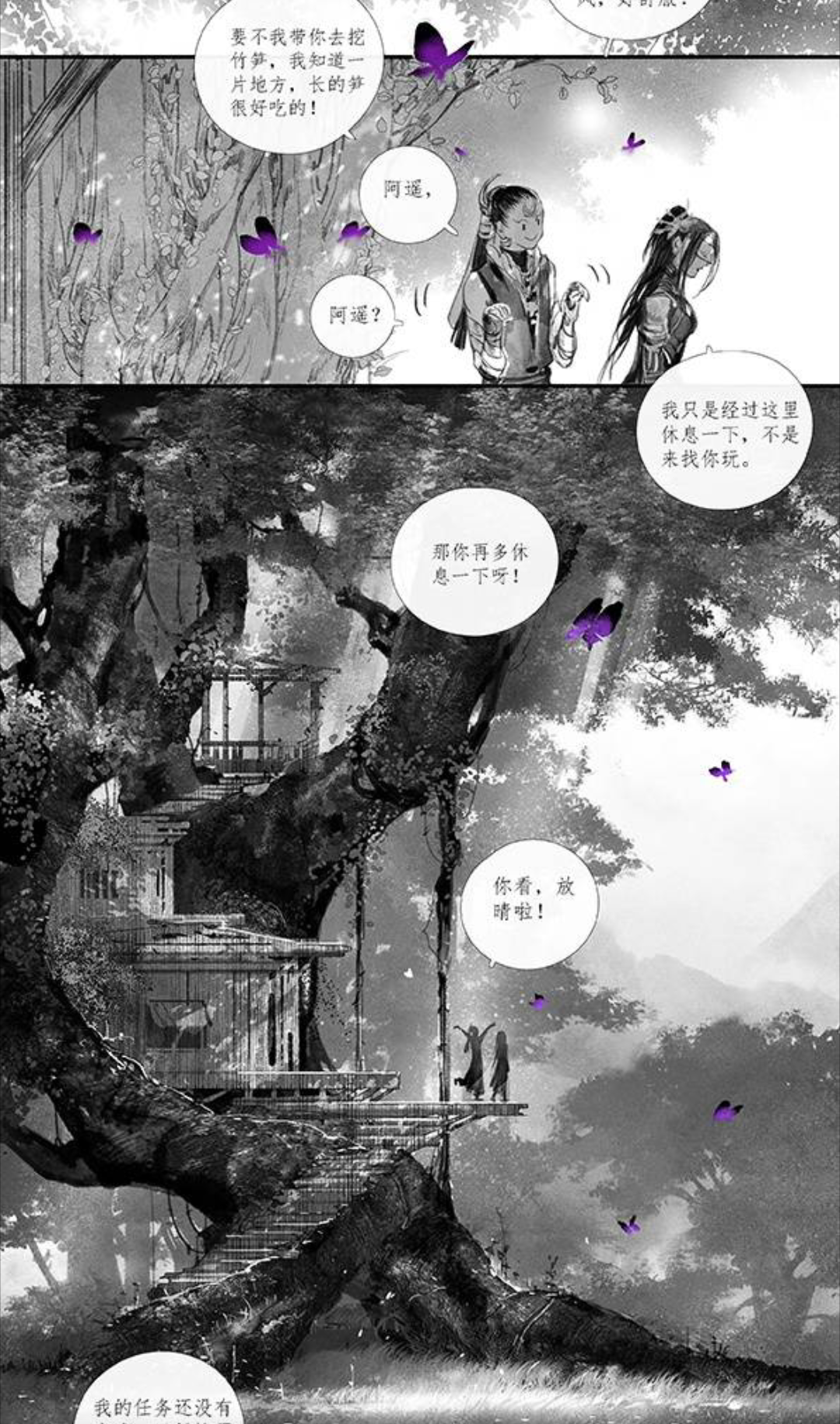 作者作画很有特点和风格,画风也很好,水墨画的质感,加上恰到好处的蓝紫点缀,让人眼前一亮