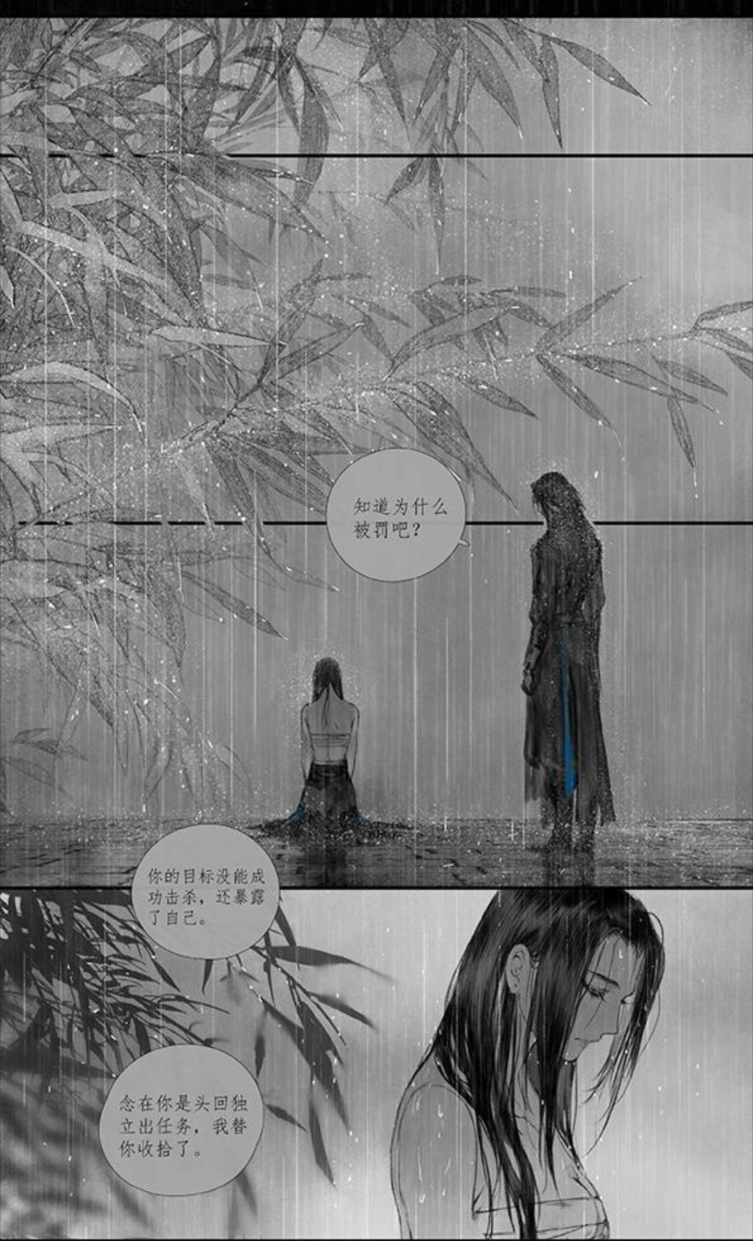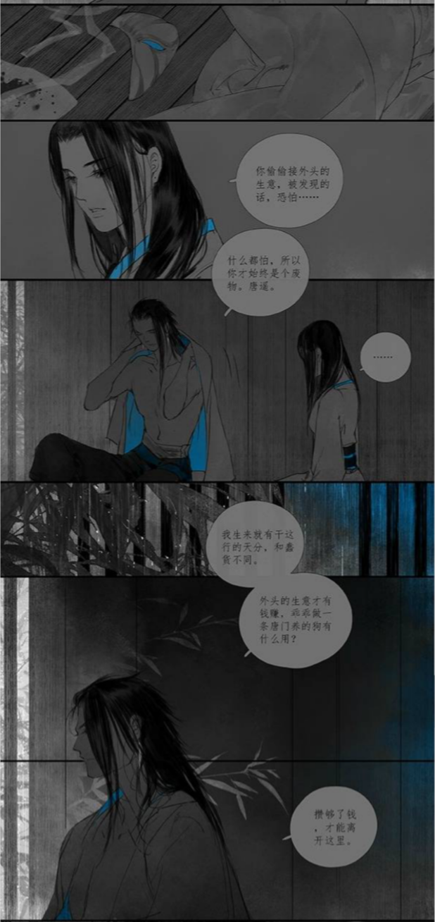 漫画虽短但对情感的把握却很细腻,每个角色之间的感情不是简单地喜欢或厌恶,譬如代岚对唐遥的若即若离,唐遥对感情的徘徊不定,唐逐对唐遥的轻蔑和控制欲的矛盾……而人物的选择更多的是身不由己,无可奈何。