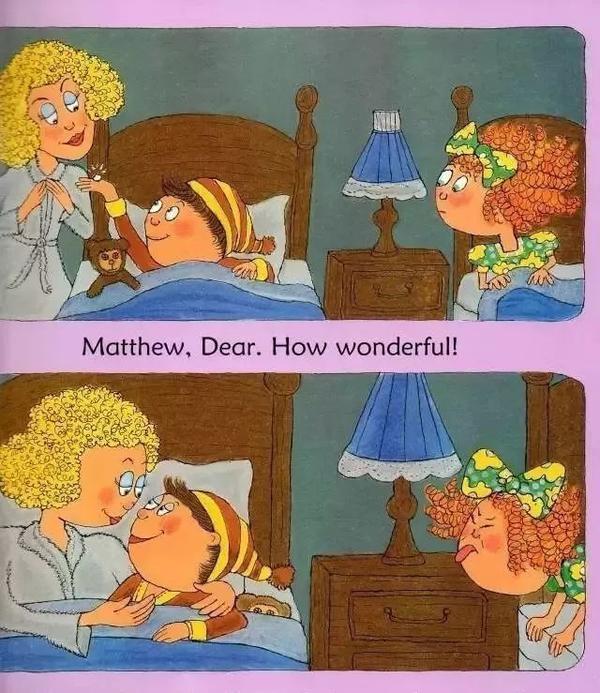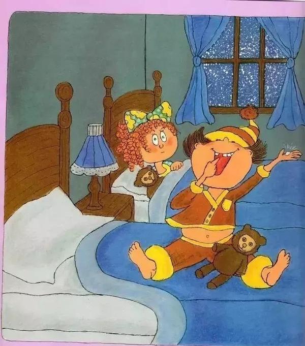 ◆ 看图观察:在妈妈给马修讲牙仙的故事的时候,马修是什么表情?另一张床上的小姑娘又是什么表情呢?