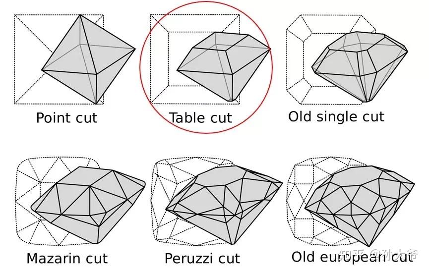 这时候的珠宝大量采用table cut钻石,中文叫桌形切割,就是把八面体的钻石原石削掉一个尖,是一种非常原始的钻石琢型。