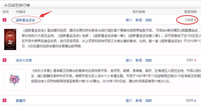 《超新星全运会》的人气占据了综艺圈的搜索首位,《快乐大本营》、《智慧树》、《中餐厅》、《做家务的男人》、《蒙面猜猜猜》都在超新星尾部追赶,从超新星的竞赛项目来看,短跑、跳高、游泳、射箭、艺术体操以及一些隐藏项目,全是中国首例较有意义的一档节目,相比各类娱乐档,这档体育类的节目,不仅包含了青春的气息,还能燃起大众们的体育细胞。