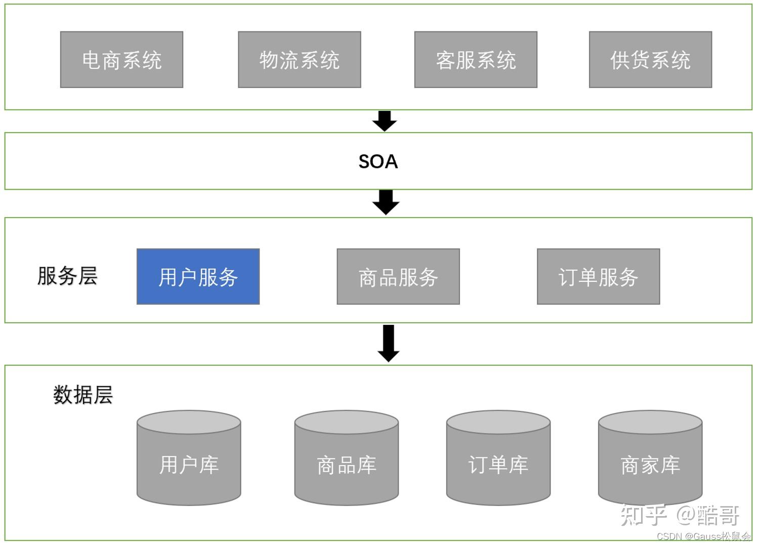 简而言之SOA可以消除信息孤岛并实现共享业务重用,我们通过SOA可以打造下图的复杂系统,其中蓝色用户服务 ,我们可以通过springboot + openGauss 技术实现。