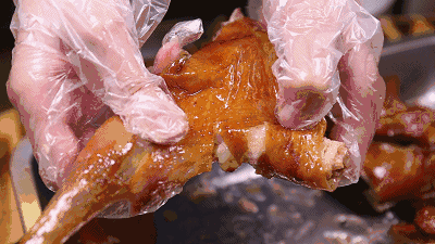 扒鸡保留着整只鸡的形状,但是鸡肉很软嫩,能轻易脱骨。