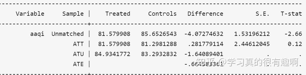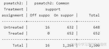 通过下表样本的最终匹配结果,我们可以看出,在对照组当中,不在共同取值范围之内(off support)的样本数仅有16个。而在共同取值范围之内的样本数则有1284个。