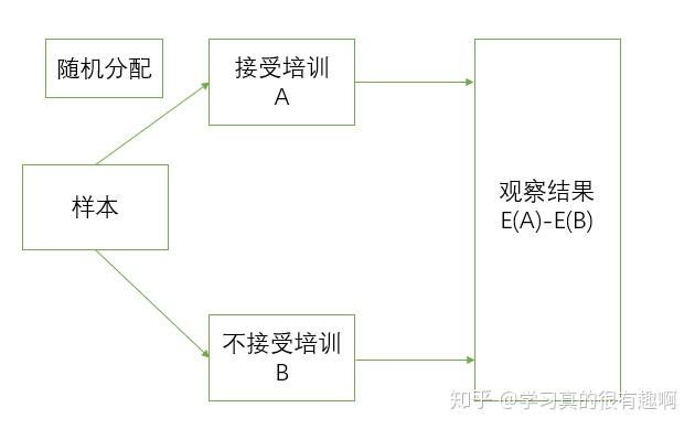 例如我们想要研究接受培训对一个人收入的影响,则需要在样本内进行随机分配,一部分接受培训,一部分不接受培训。之后我们将两组的观察结果进行对比,从而可以得出培训对个人收入的净影响。这是因为由于我们的处理变量D1(是否接受培训)是随机的,因此将不会与干扰项相关,不存在内生性问题。