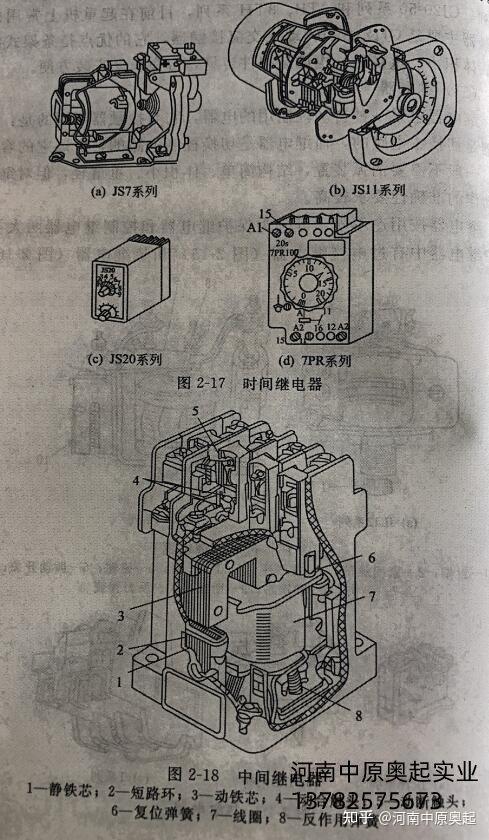 继电器按用途不同,可分为保护继电器和控制继电器两大类,保护继电器中有过电流继电器(图2-15)和热继电器(图2-16) ,控制继电器中有时间继电器(图2-17)和中间继电器(图2-18)等。