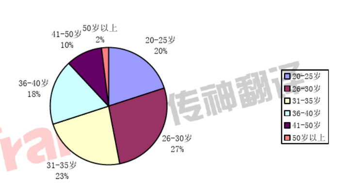 关于中国译员的年龄,我没有找到特别好的数据。只有一个传神公司在 2007年 做的调查,里面统计了译员的年龄数据。