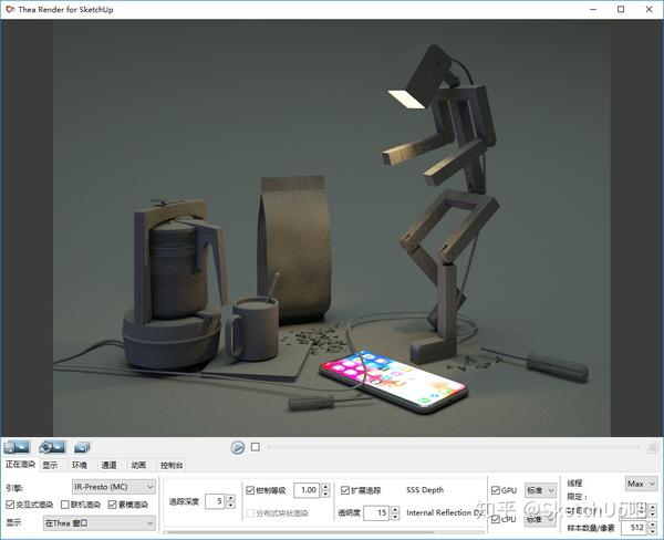 在这一类渲染器里(SketchUp 内置),我觉得目前比较完善和实用的就是 Vray 和 Thea 了。我自己是做室内设计的,这几年一直在使用 Thea 工作,喜欢它操作流畅便捷,互动式渲染比较利于设计过程中对整体效果的检验和调节。