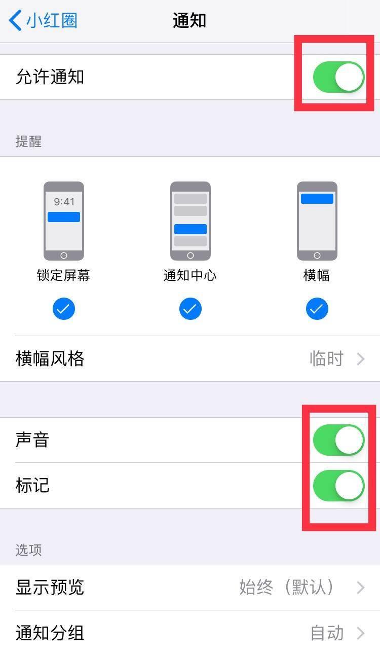 3.在“通知”里打开“允许通知”、“声音”以及“标记”的按钮,如图3。