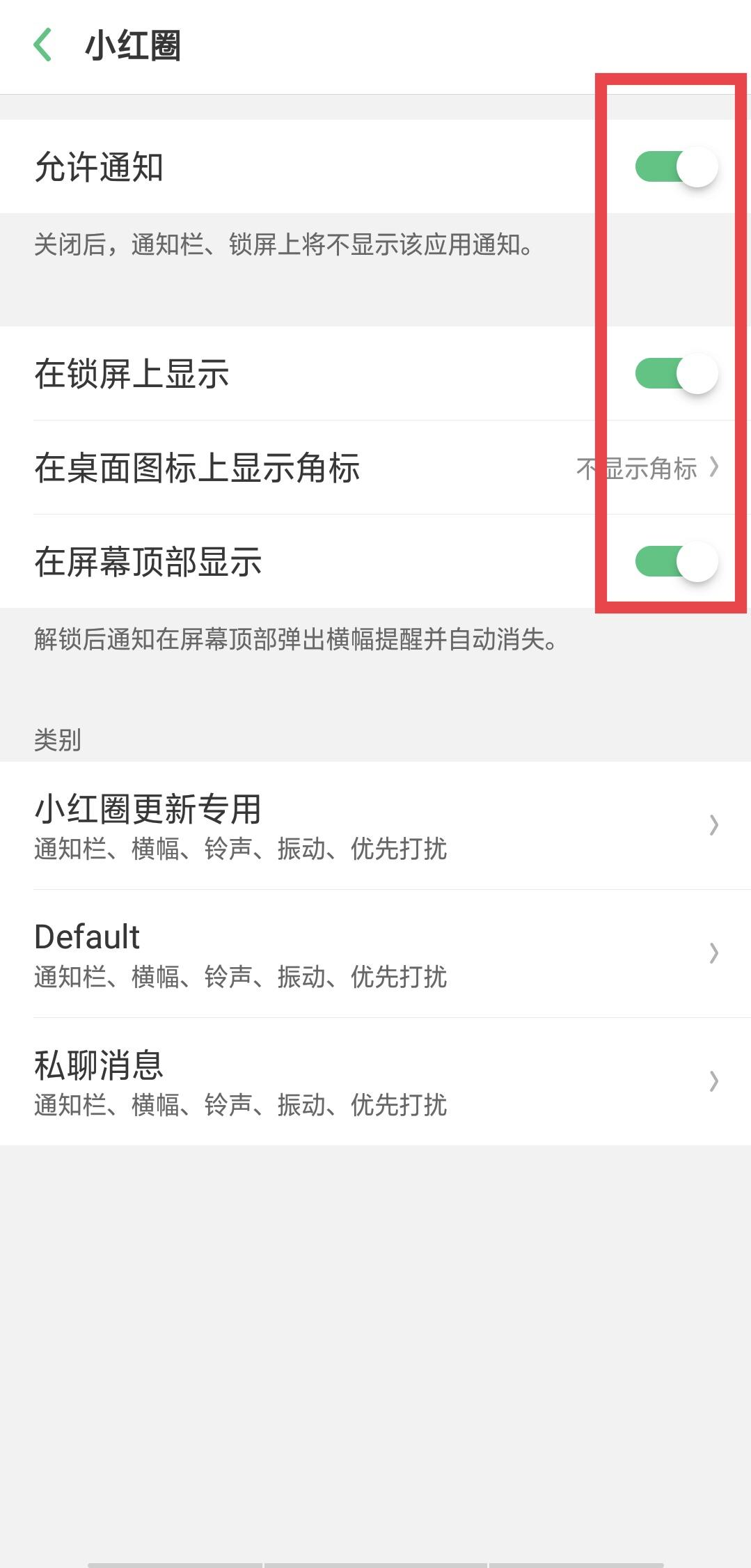 4.打开“允许通知”、“在锁屏上显示”、“在屏幕顶部显示”等选项的按钮,如图4。