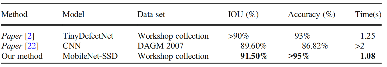 与现有的车身缺陷检测技术进行了比较。我们的模型基于MobileNet SSD模型,数据集采用workshop拍摄模式,而 论文[1] 模型为CNN,数据集采用workshop拍摄模式, 论文[2] 模型为CNN,数据集采用DAGM 2007。对于IOU,我们的数据采集方法与论文[1]相同。但在准确性和实时性方面,本文的方法更有效。